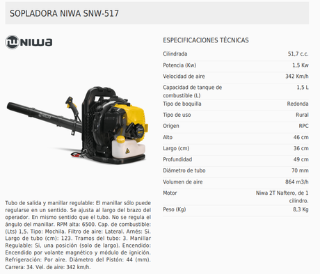 Sopladora a Explosión 2T 51,7cc Tipo Mochila de 864 m3/h Niwa SNW-517