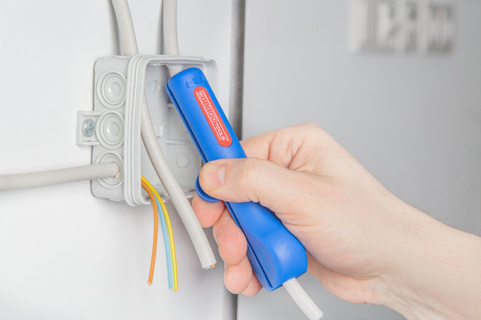 El WEICON No. 13 es la herramienta especializada para el desaislado rápido y cómodo de todos los cables redondos comunes y cables para ambientes húmedos (como cables NYM de 3 x 1,5 mm² a 5 x 2,5 mm²). Su diseño alargado y cabezal redondeado están optimizados para encajar perfectamente en la geometría de las cajas de pared modernas, facilitando el trabajo en cavidades profundas.