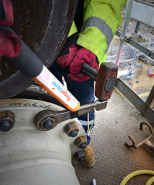 Sin el protector de dedos, te expones a posibles lesiones en manos o dedos. Al usar el FingerSaver puedes mantener las manos alejadas de cualquier posible peligro de impacto. La herramienta FingerSaver te permite mitigar cualquier riesgo relacionado con la tarea y te da la confianza para realizar la actividad de forma segura.