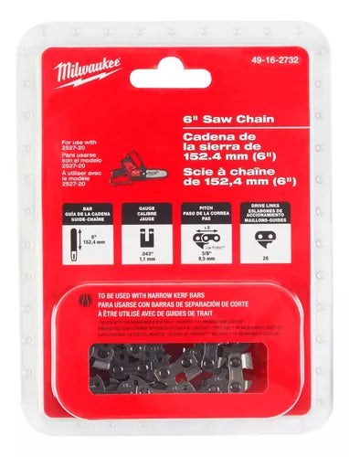 La cadena de sierra de 6" Milwaukee® 49-16-2732 está diseñada para su uso con la sierra de podar de 6" MILWAUKEE® M12 FUEL™ HATCHET™ (2527-20). Su diseño optimiza el rendimiento y la seguridad durante el corte.