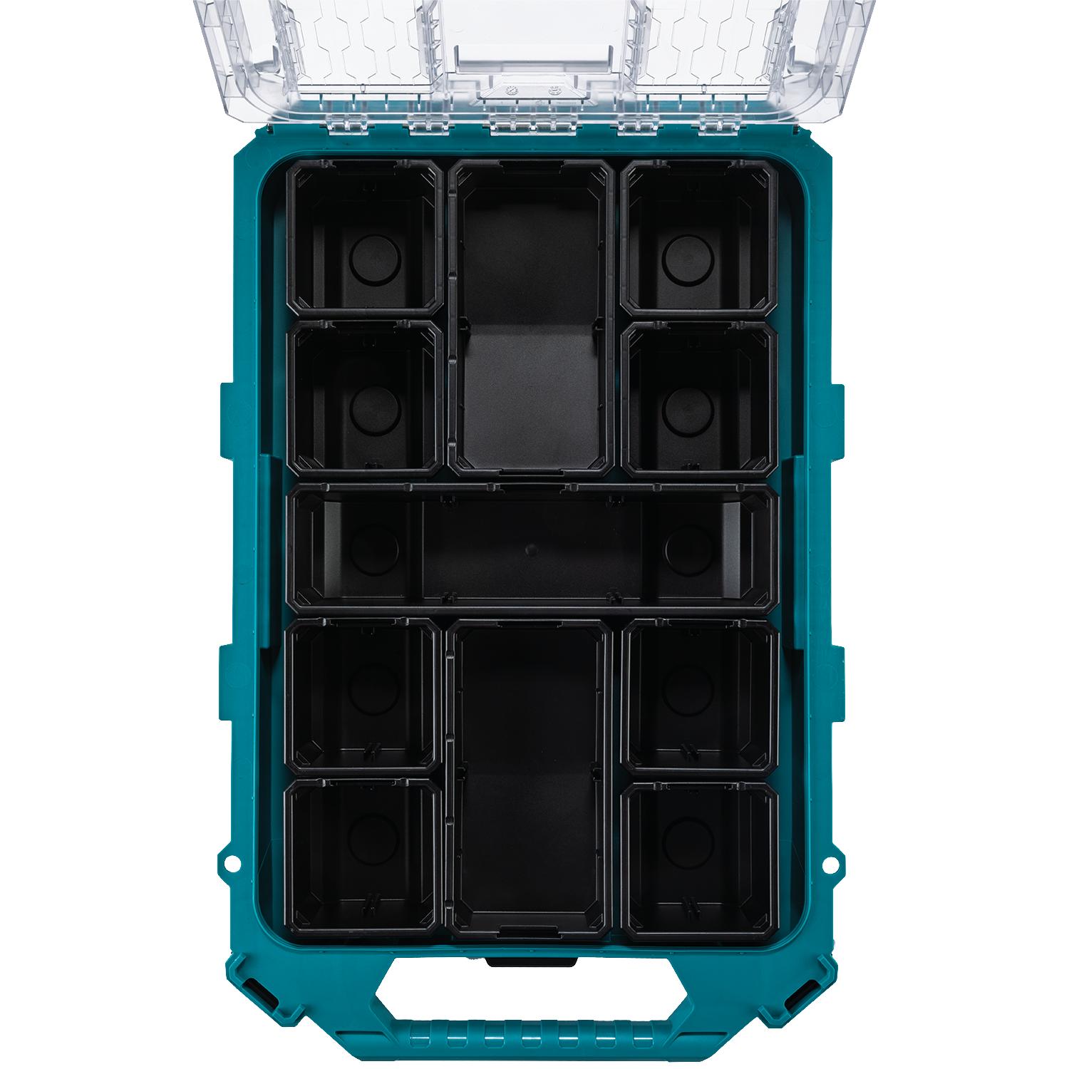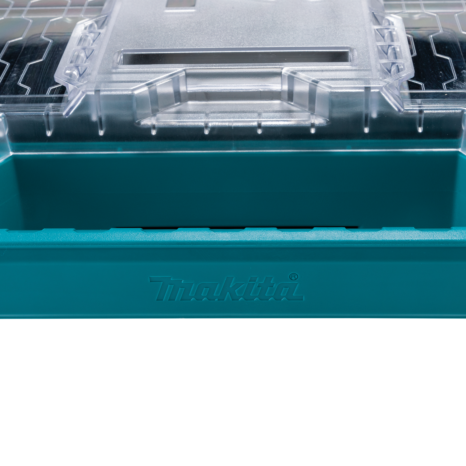El Organizador de Bajo Perfil Mediano MAKTRAK™ (T-90059) de Makita es una solución avanzada en almacenamiento modular, diseñada para el transporte y organización de herramientas y equipos en el sitio de trabajo. Su innovador diseño permite hasta un 50% más de capacidad de almacenamiento en comparación con la competencia, facilitando el acceso a los contenidos gracias a su tapa transparente.